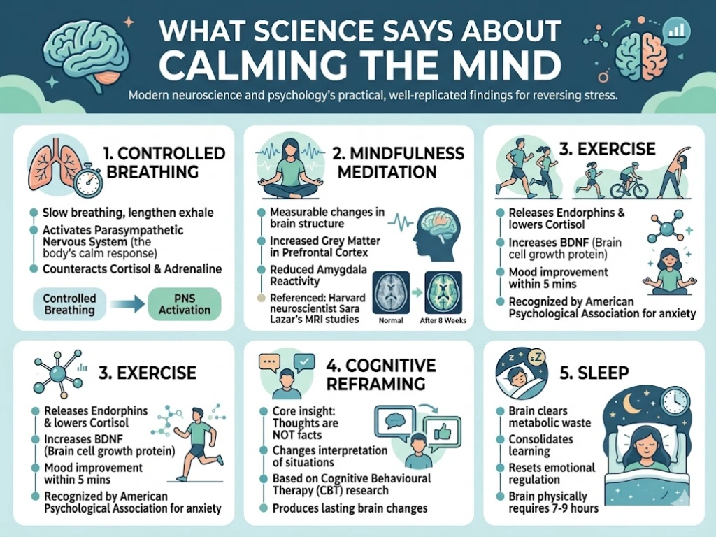 Modern neuroscience and psychology have given us a detailed map of what happens in the brain and body when we're stressed — and what actually reverses it. The findings are consistent, well-replicated, and practical.