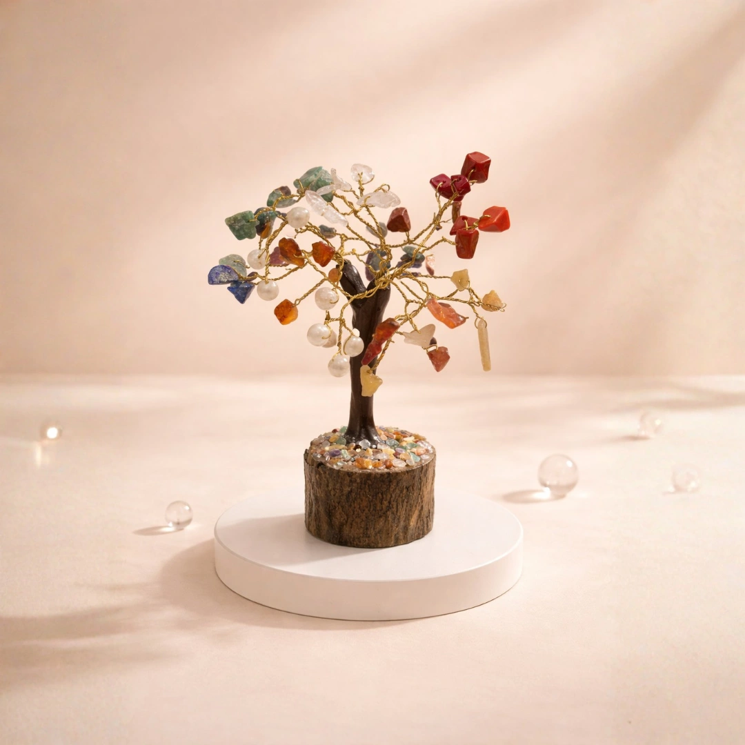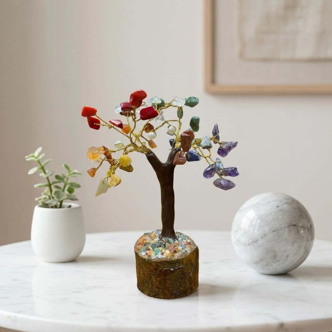 A 7 Chakra tree physically embodies this. The wooden base — earth, roots, the first chakra's grounding. The trunk — the sushumna nadi, the central energy channel of the spine. The branches — the energy spreading outward in all directions. The crystals on each branch — the seven chakras, distributed across the whole, each in its natural position.