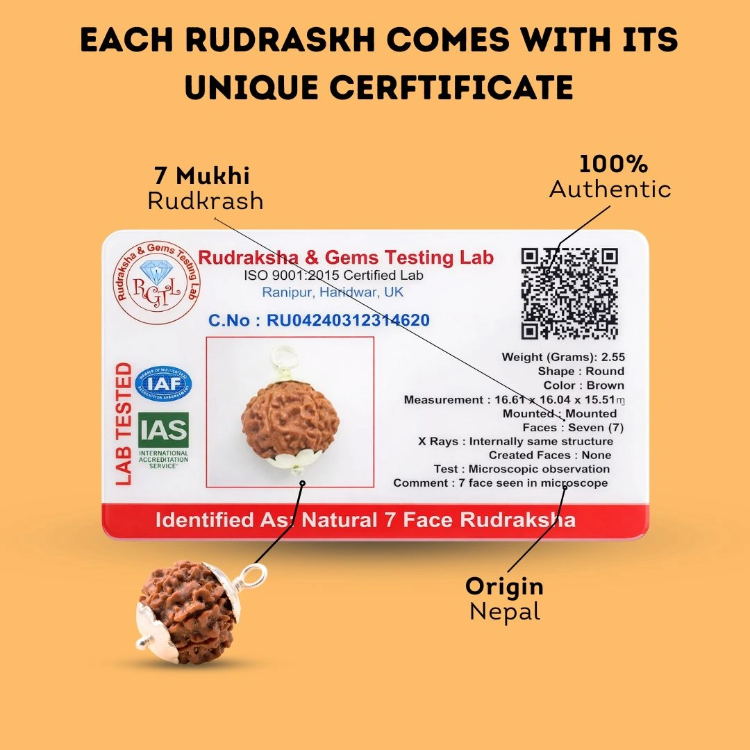 The 7 Mukhi Rudraksha is one of the most documented beads in Vedic tradition. It is associated with the Saptarishi — the seven great sages — and with Goddess Mahalakshmi herself. Its energy is said to open the flow of abundance, remove financial blockages, and bring a deep, grounded calm to the person who wears it sincerely.