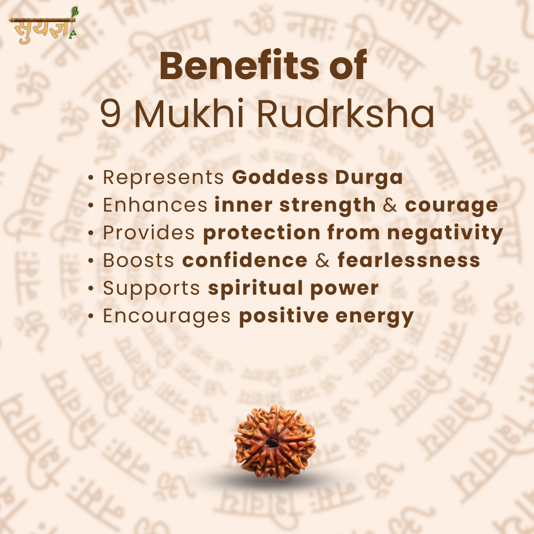 9 Mukhi Rudraksha ko hum Suyagya mein "Shakti ka Rudraksha" kehte hain. Yeh Maa Durga ki energy se connected hai – wo Maa jo apne bacchon ko protect karti hai aur unhe fearless banati hai.
