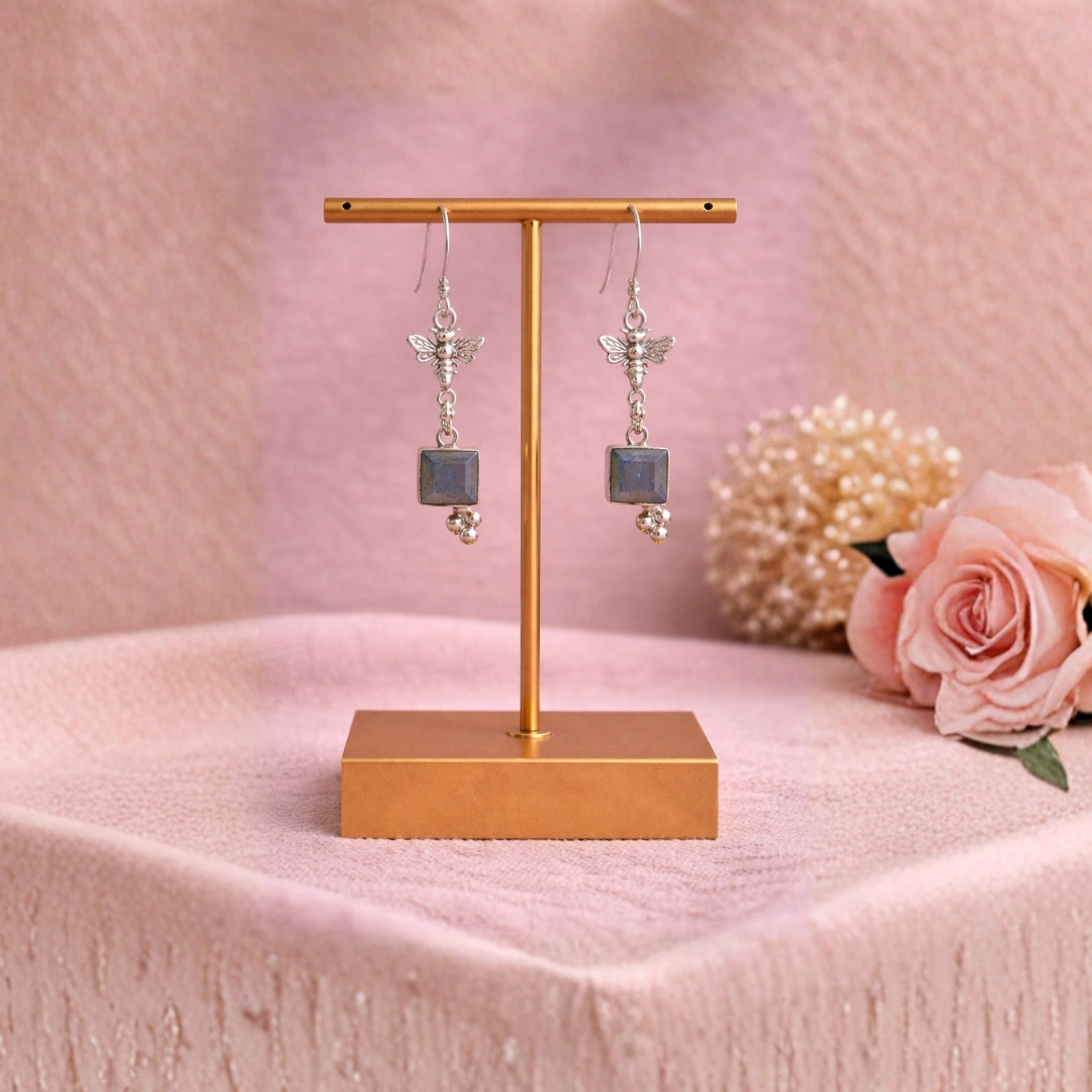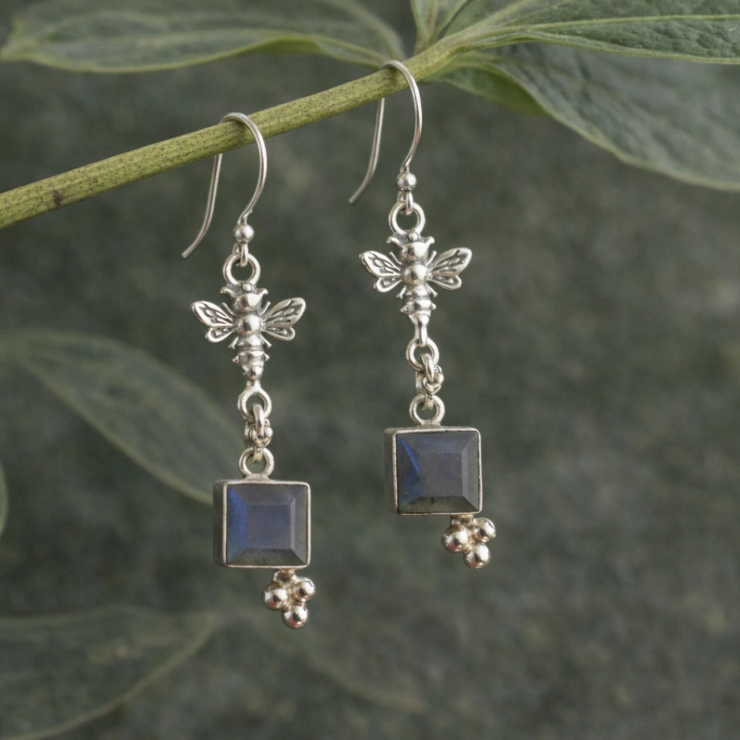 Whimsical meets elegant with these Labradorite Bee Earrings, handcrafted in 925 sterling silver. Each earring features a beautifully faceted labradorite gemstone that flashes with iridescent hues, paired with a delicate bee design that symbolizes creativity, focus, and harmony.