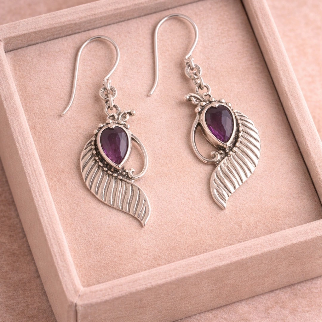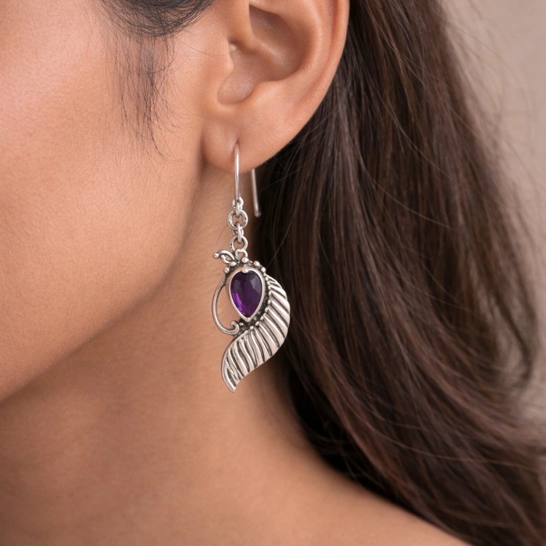 Yeh 925 Sterling Silver Natural Amethyst Leaf Earrings ready hain tujhe nature ki peace aur amethyst ki calm dono dene ke liye. Forest serenity chahiye? Crystal calm chahiye? Botanical beauty chahiye? Yeh earrings sab deliver karti hain ek organic elegant package mein.