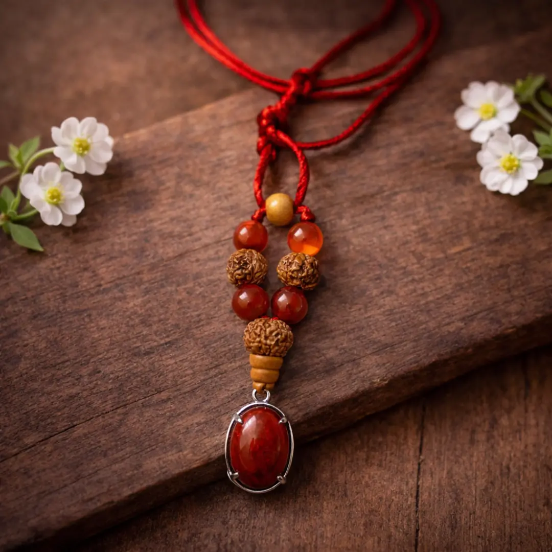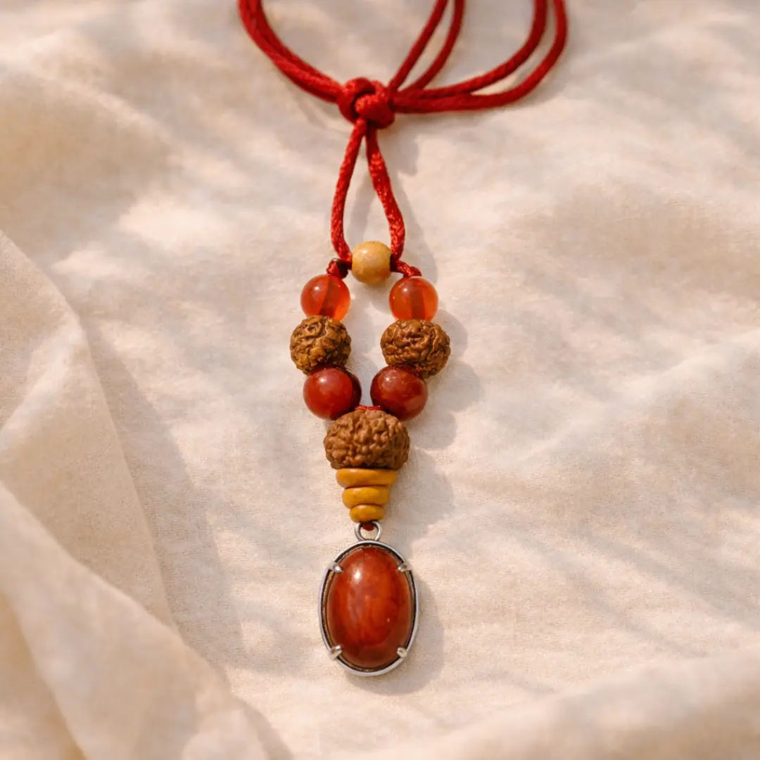 Above the Carnelian beads, in the pattern of 3+3+9, rest the Rudraksha beads — and for Mesh rashi, their presence transforms this pendant from a crystal piece into a complete spiritual protection system.