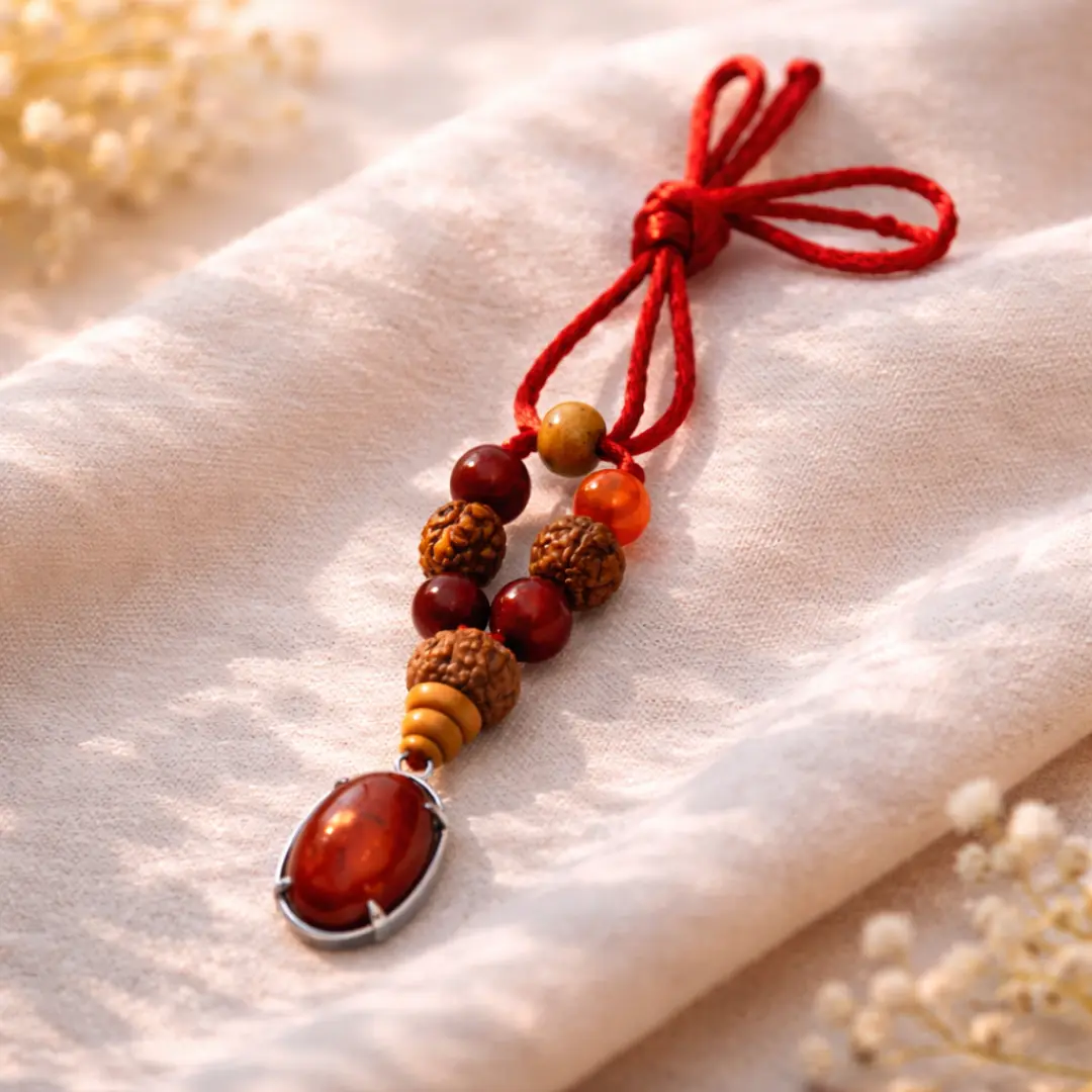 Every Red Jasper oval is individually selected — deep, genuine red, natural grain, genuine iron-rich density. Every Carnelian bead quality-checked — natural orange-red, genuine translucency, no dyed agate imitation. Every Rudraksha bead authenticated — genuine mukhi lines, natural surface, certified origin. The complete pendant — government lab certified, certificate available on request. Every Aries Mesh Rashi Pendant energetically cleansed and Mars-activated before dispatch — sound cleansing, Tuesday Mangalvar setting, Om Angarakaya Namaha activation.