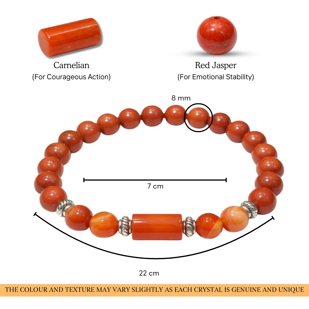 Together, red jasper and carnelian create the complete energetic support system that Mesh rashi was born for: deep roots, brave action, Mars fire channeled into constructive power.