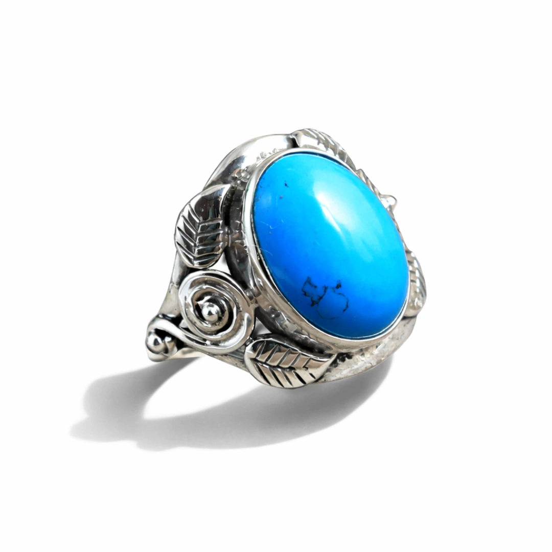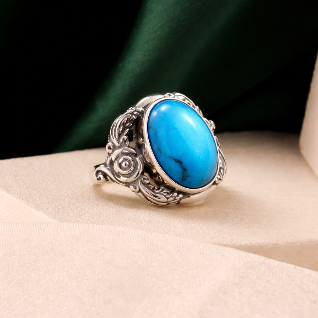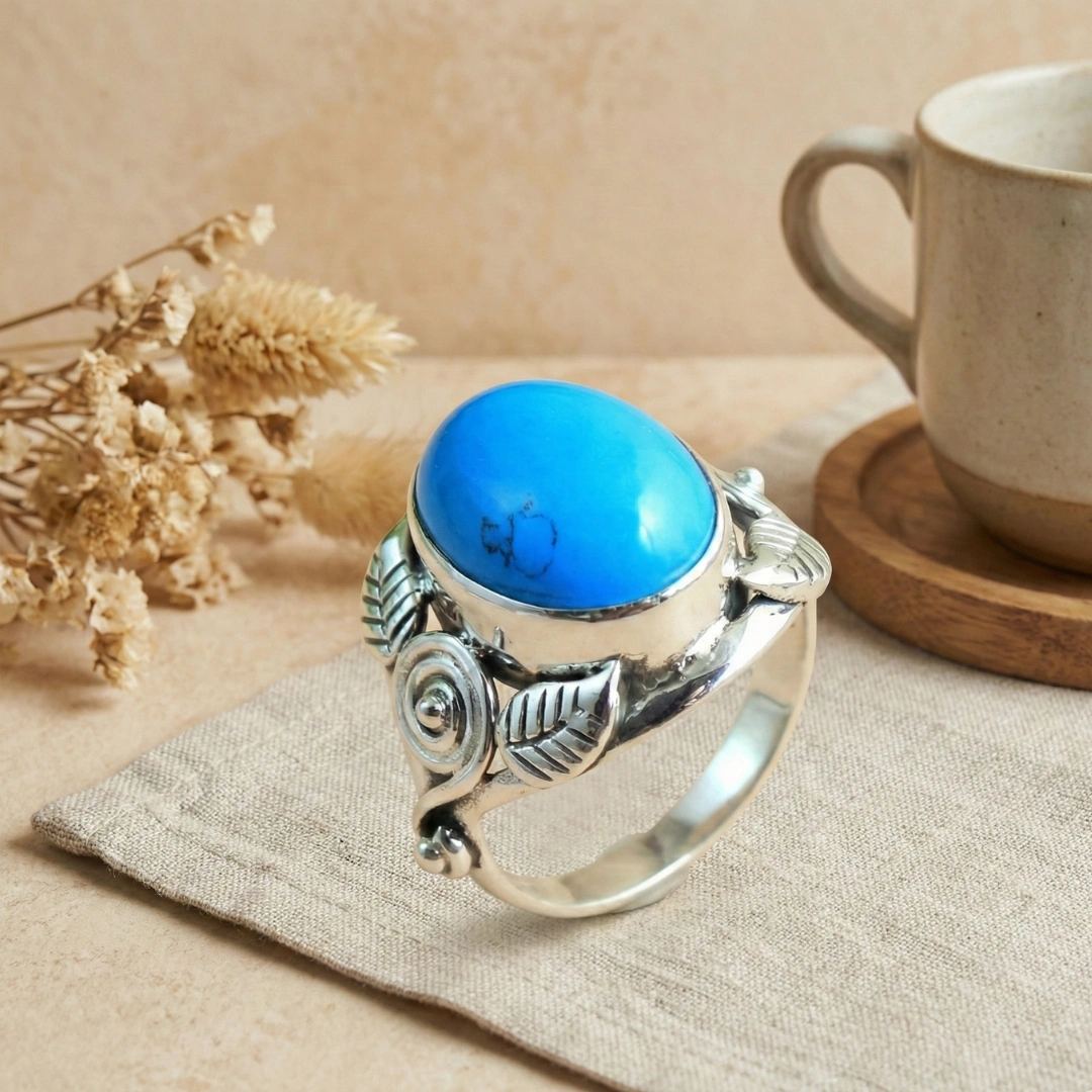 Natural matrix patterns: Har turquoise stone unique hai—woh black/brown veining (matrix) Earth ki signature hai. No two stones identical—aapki ring one-of-a-kind hai.