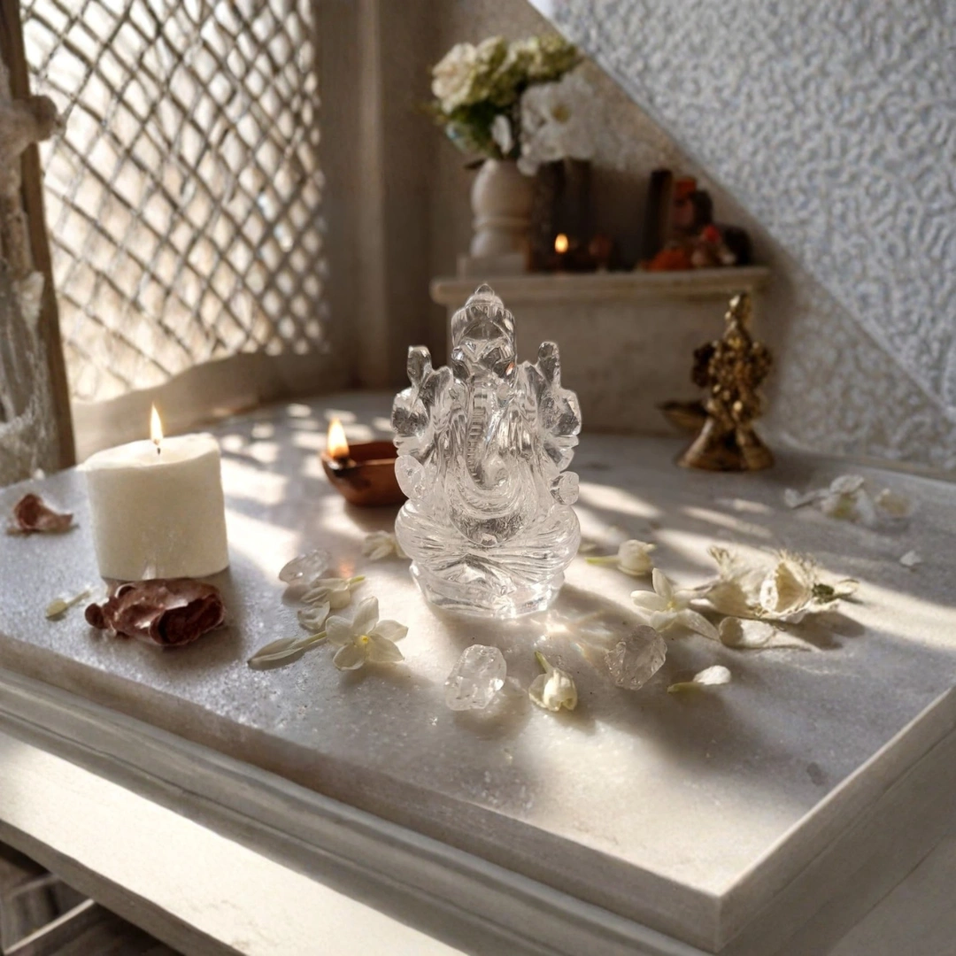 This is why crystal Ganesha idols have been used in homes and places of business for centuries. Not just as symbols of devotion — as active energy tools. A clear quartz Ganesha in the entrance of a home clears the energy of everything that enters. In an office, it amplifies the clarity of decisions made in that space. In a home temple, it amplifies the energy of every prayer, every intention, every meditation offered in that corner.