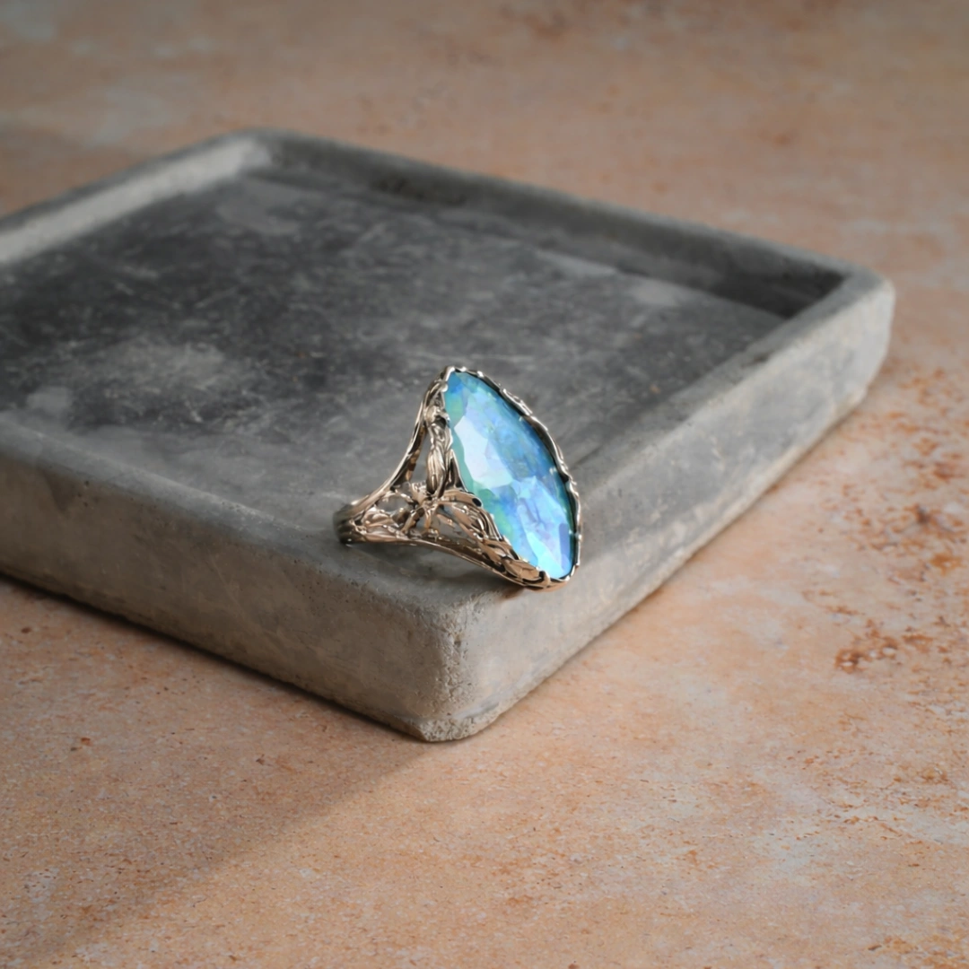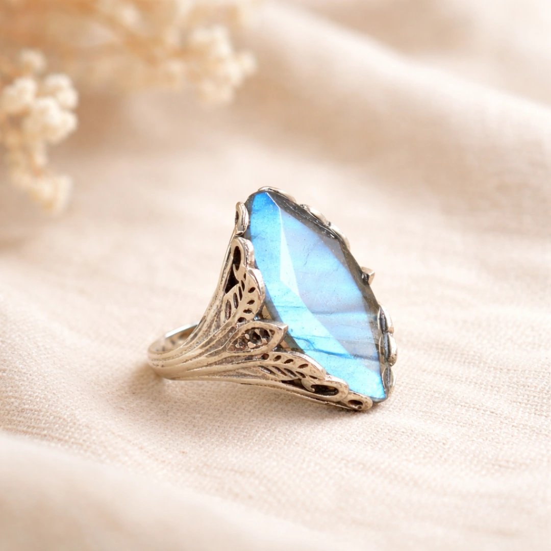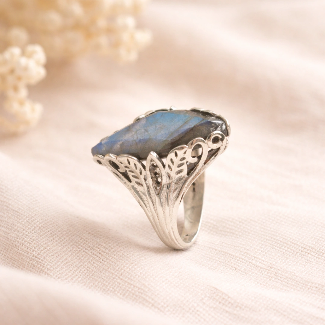 Har piece unique hoti hai – koi do Labradorite stones exactly same flash nahi dikhati. Aapki ring literally one-of-a-kind hai.