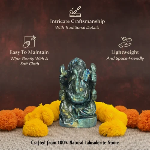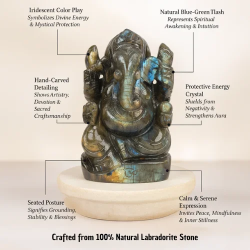Vastu Correction — Placing this murti in the pooja room or at the entrance brings both Ganesha's Vastu-correcting energy and Labradorite's space-purifying vibrations. The energy of the entire space elevates.
