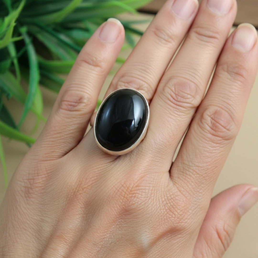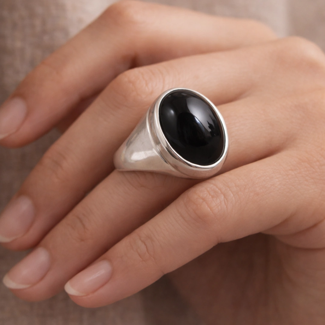 Deep black onyx with smooth, glossy finish—masculine aesthetic.
