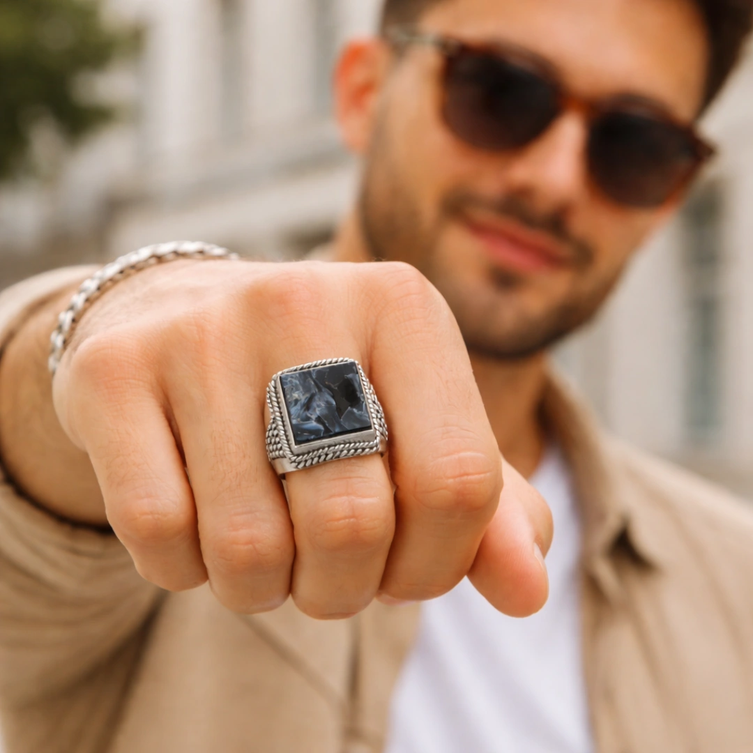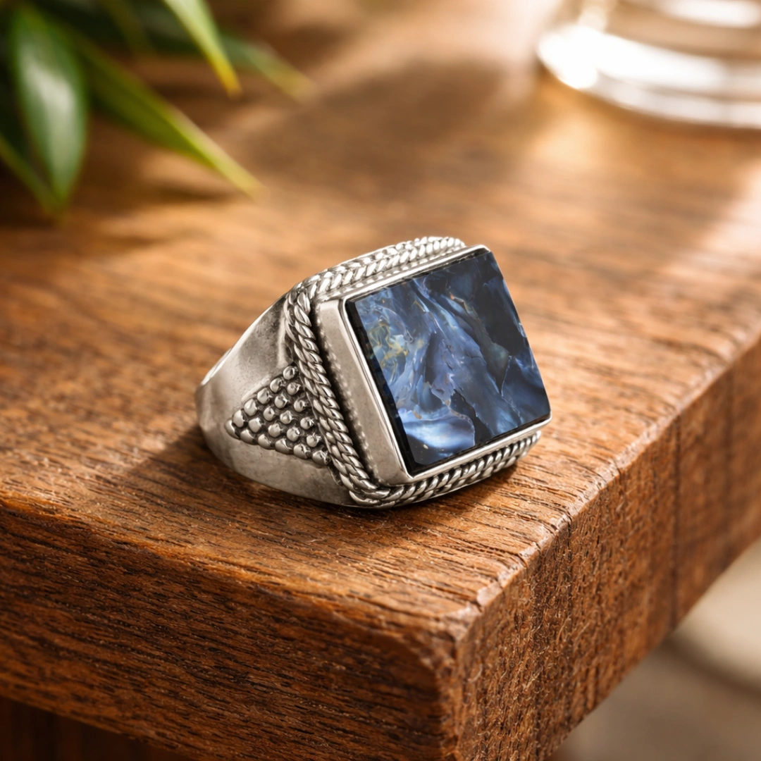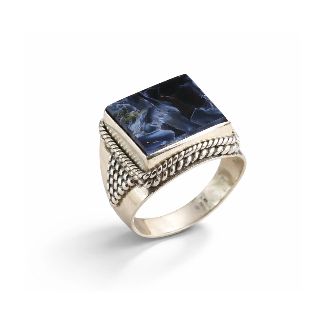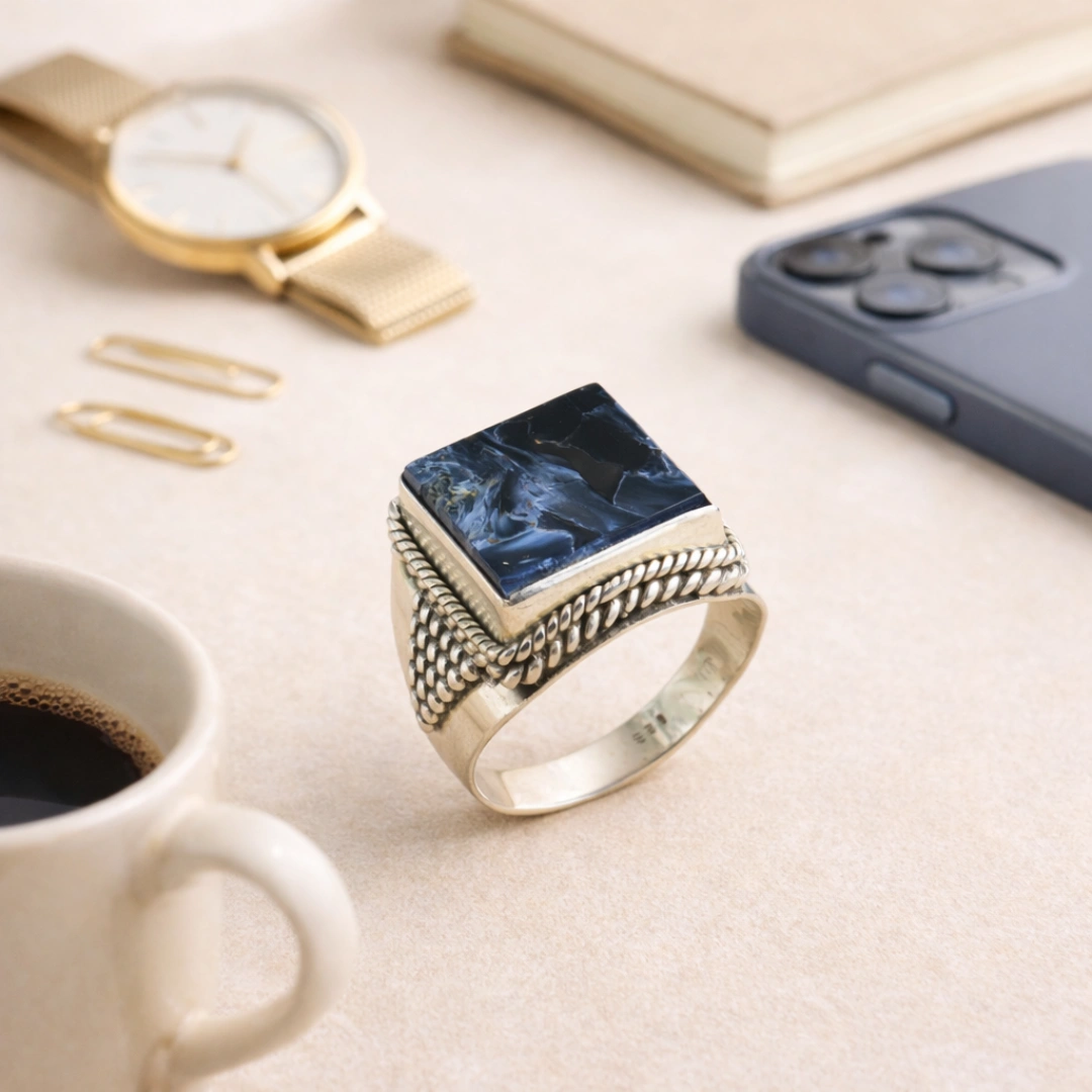 This handcrafted men’s signet ring is made from solid 925 sterling silver and features a striking Pietersite jasper gemstone known for its dramatic natural patterns. Bold and distinctive, it’s designed for everyday wear or special occasions and makes a meaningful gift for him.