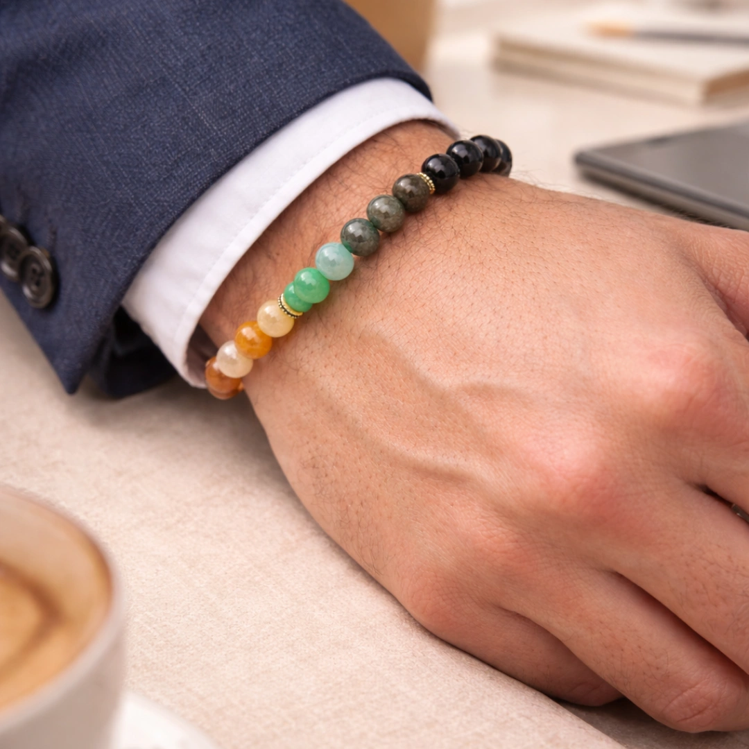 "Pyrite paisa attract karta hai. Green Aventurine luck laata hai. Yellow Aventurine creative soch deta hai. Clear Quartz sab ki energy double karta hai. Hakik protect karta hai. Aur yeh paanch milke teri kalaai pe ek money magnet system banate hain. Rs 599 me. Seedhi baat."