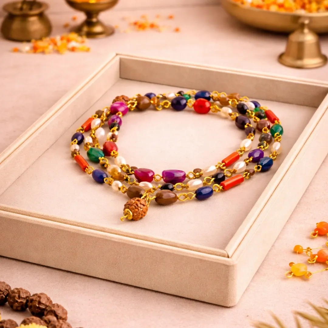 This mala is ideal for students who need planetary support but have limited budget, young professionals starting their career who want spiritual protection from day one, families who want Navgraha balance for their home pooja without heavy investment, first-time Navratna users who want to experience planetary balance before investing in Premium, anyone who needs a Navrattan Mala for pooja room, Diwali pooja, or Navgraha rituals, people who want multiple Navrattan Malas for different locations — home, office, parents — at affordable cost, gifting purposes where you want to give meaningful spiritual gift without overspending, and anyone who believes that spiritual protection should be accessible, not exclusive.