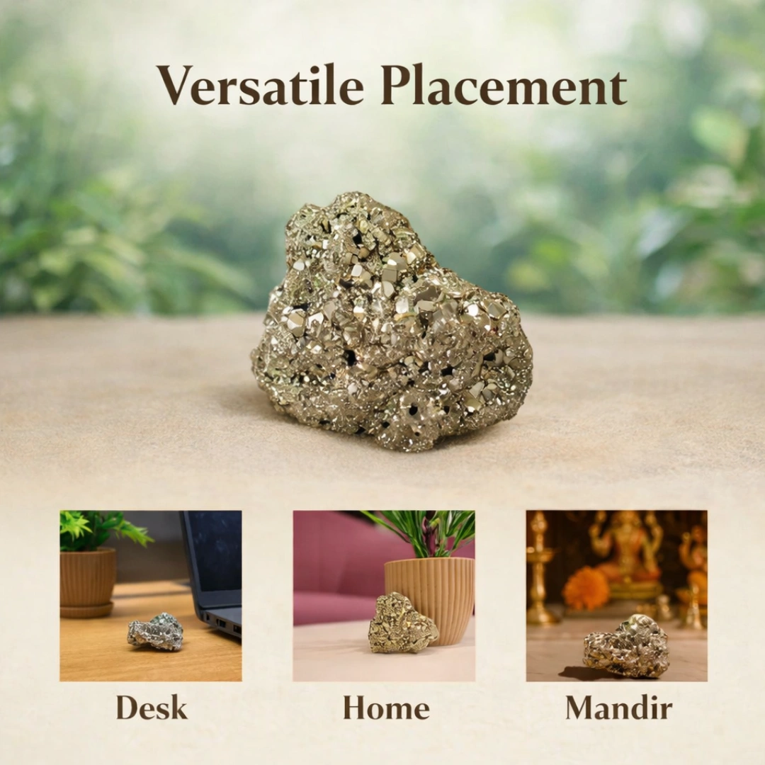 Aaj, centuries baad bhi, yeh natural pyrite stone usi energy ko carry karta hai. Jo businessman apne office desk pe pyrite stone rakhta hai — woh usi determination ko invite kar raha hota hai. Jo student apni study table ke left corner mein pyrite crystal rakhta hai — woh usi focus energy ko activate kar raha hota hai. Jo ghar ke cash counter ke paas original pyrite stone rakhta hai — woh usi abundance ki frequency ko call kar raha hota hai.