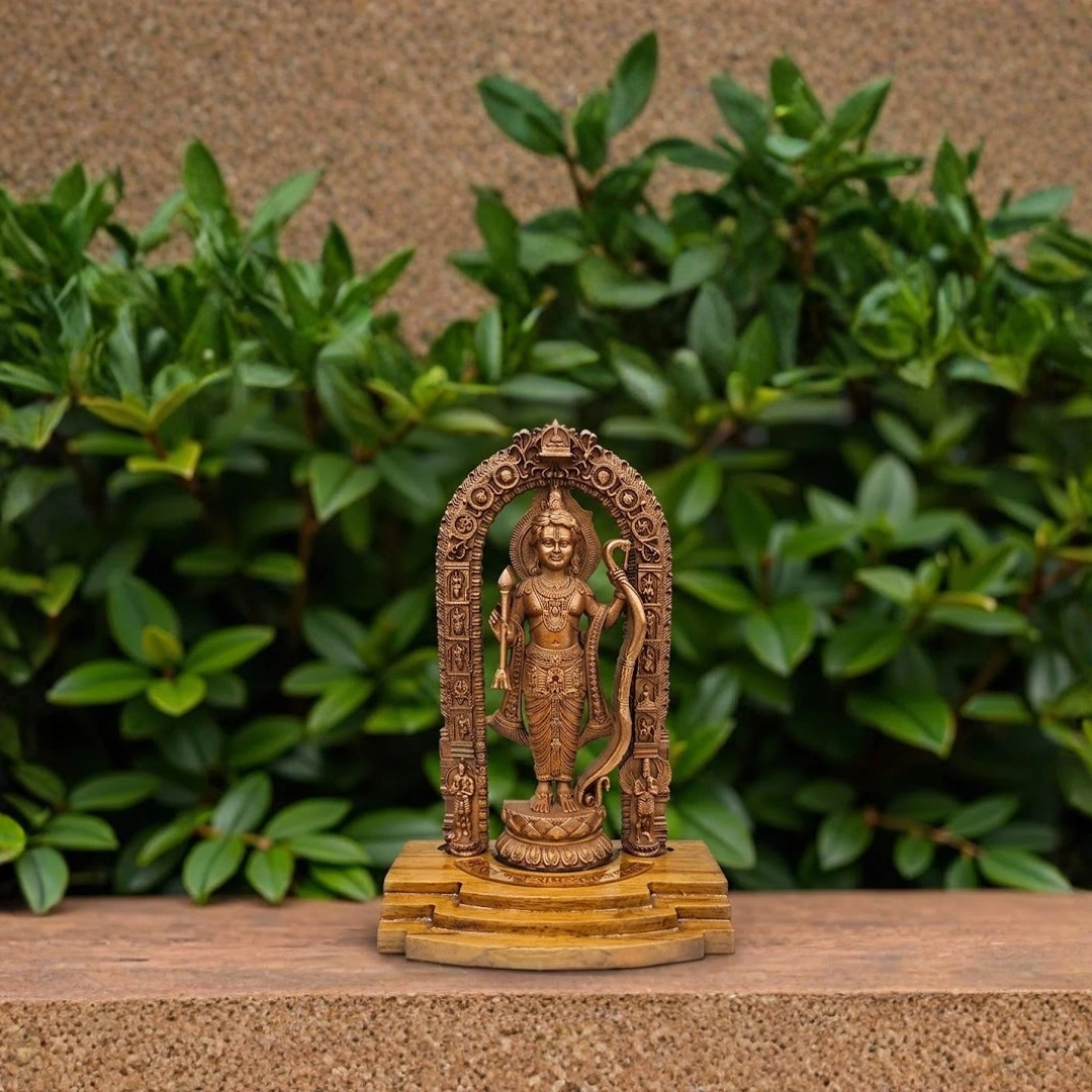 This murti carries that energy. The standing Ram Lalla form — the same form that moved the nation in January 2024 — handcrafted in pure copper, framed by a temple arch that places him exactly where he belongs: at the center, within the divine threshold, completely present.