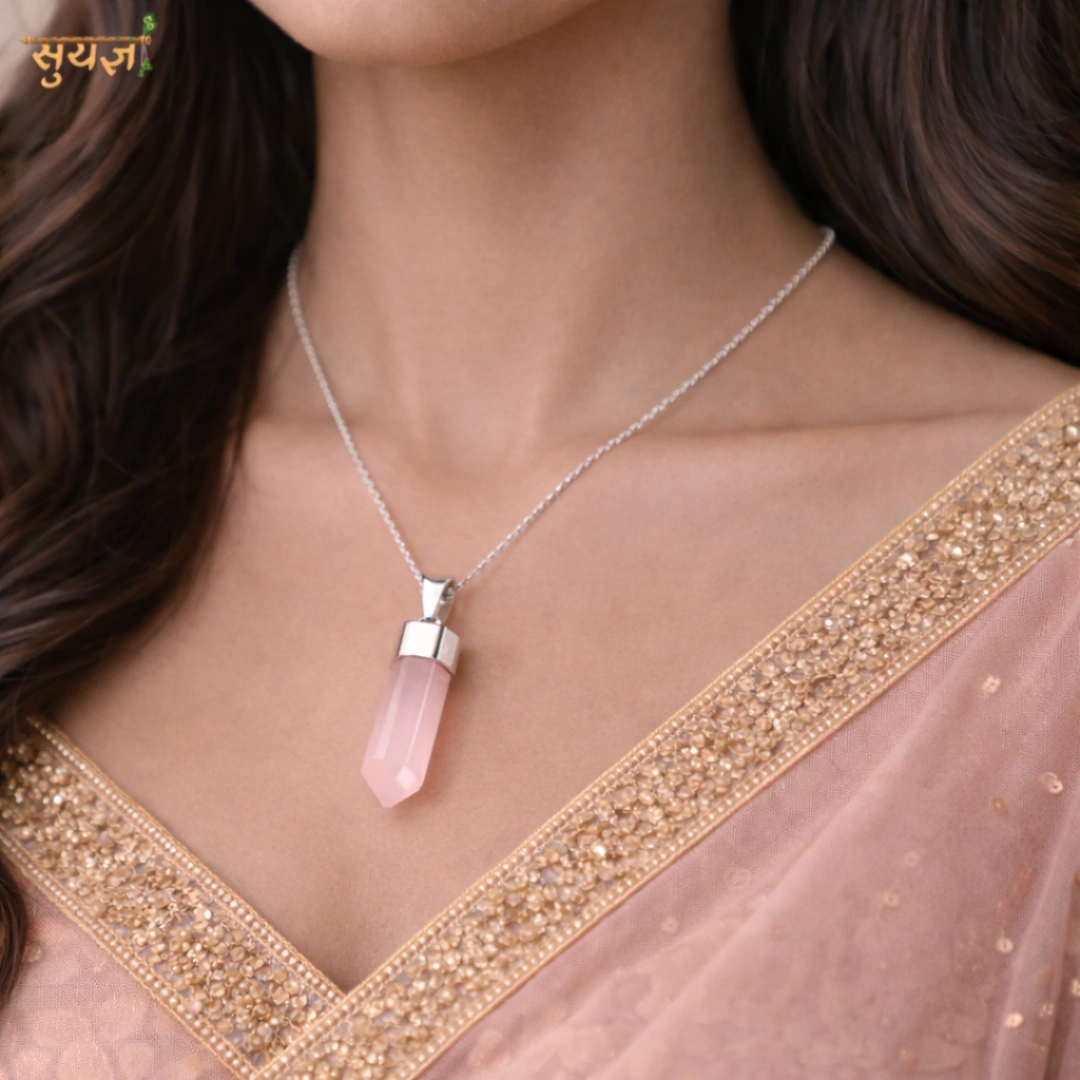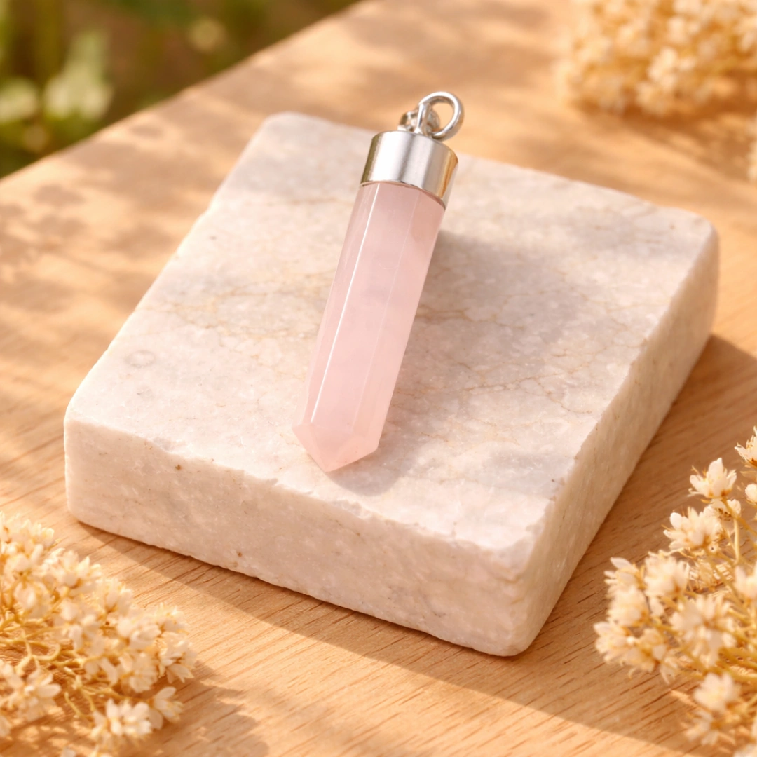 Rose Quartz is known as the stone of unconditional love. It is believed to attract love, strengthen relationships, and heal emotional wounds while promoting self-love and inner peace. Wearing this pendant can help balance emotions, reduce stress, and create a sense of warmth and positivity.