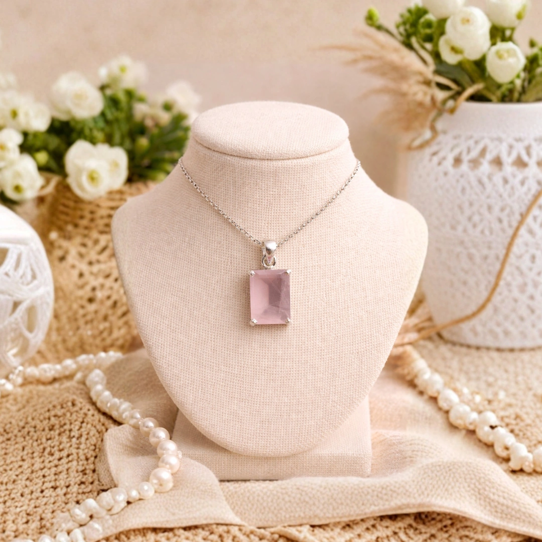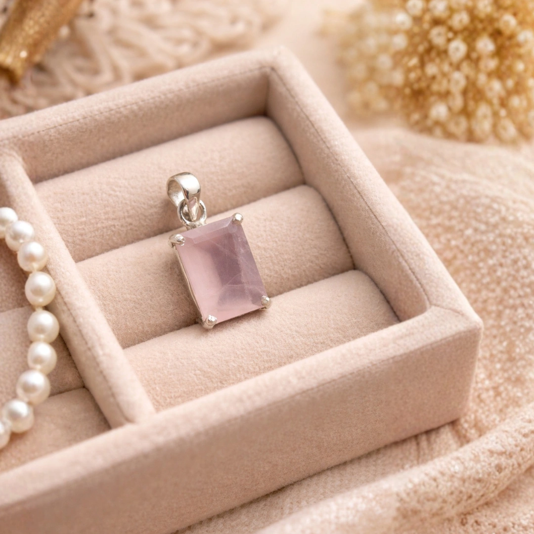Is pendant mein Rose Quartz ko prong setting mein set kiya gaya hai - aur yeh choice deliberate hai.