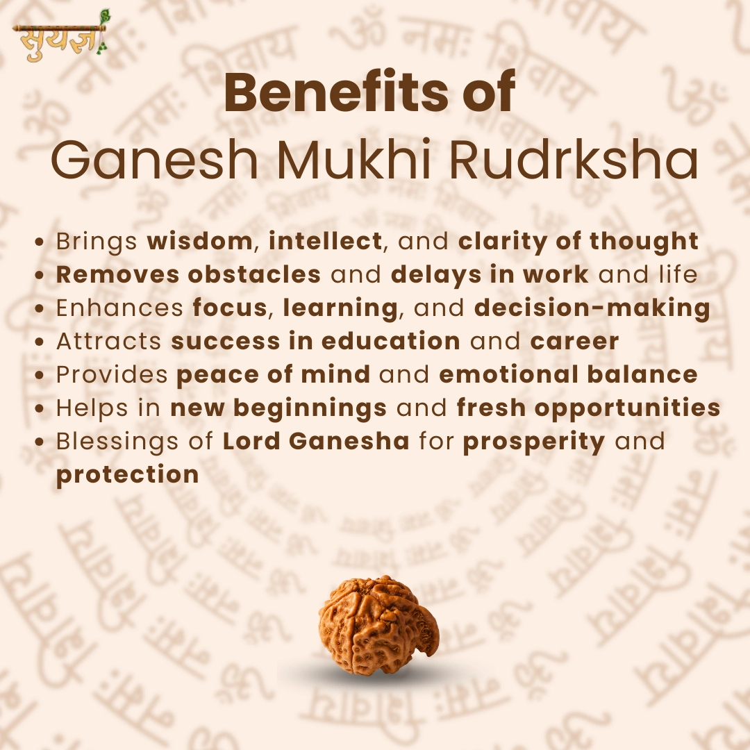 Ganesh ji ko Pratham Pujya kaha jaata hai – sabse pehle unki pooja hoti hai. Yeh Rudraksha unhi ki energy carry karta hai. Traditionally iska role maana jaata hai:
