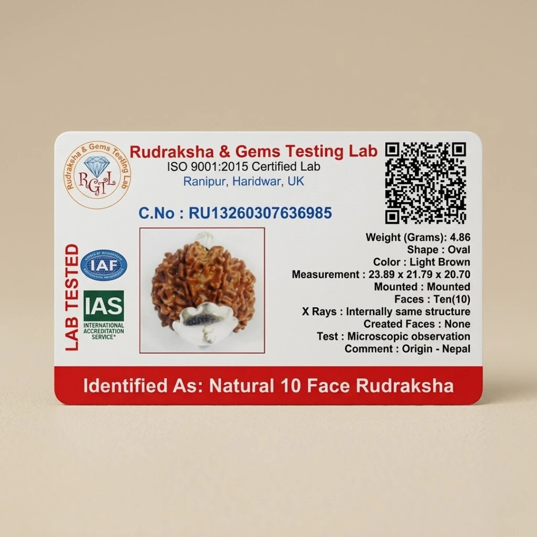 Every bead is individually inspected, all ten faces verified, and govt lab certified. Not batch tested. Nepal — the original standard.