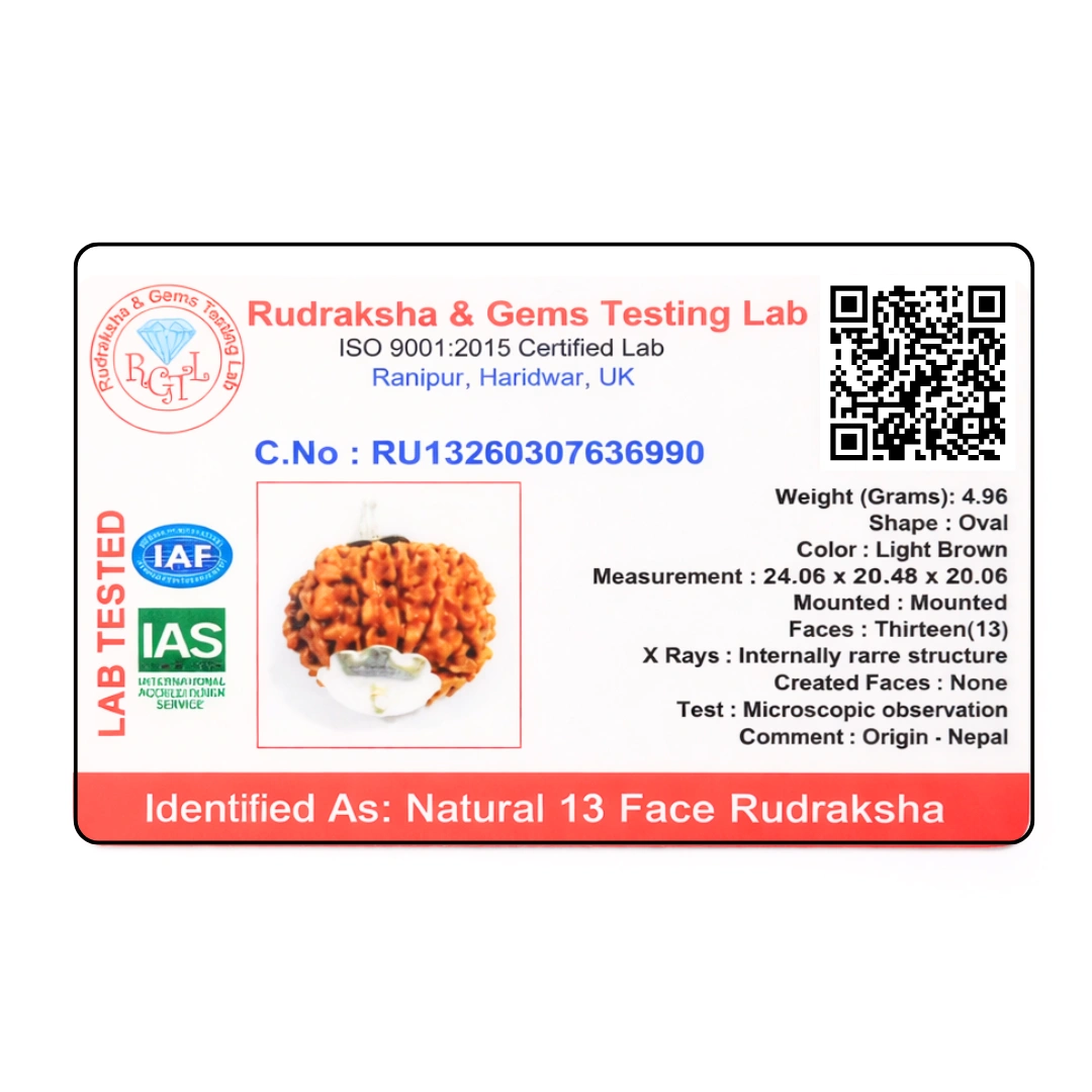 Most rudraksha X-ray certifications note "internally same structure" — confirming the bead is naturally formed. "Internally rare structure" means the internal compartment formation of this 13 Mukhi bead is unusual — the natural geometry inside is less commonly found. This is not a defect. It is a rarity marker. The bead is genuine, naturally formed, and internally distinctive.