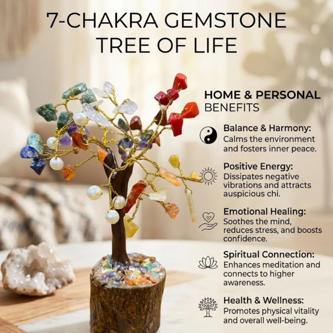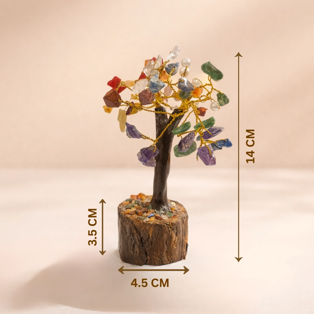 A 7 Chakra tree physically embodies this. The wooden base — earth, roots, the first chakra's grounding. The trunk — the sushumna nadi, the central energy channel of the spine. The branches — the energy spreading outward in all directions. The crystals on each branch — the seven chakras, distributed across the whole, each in its natural position.