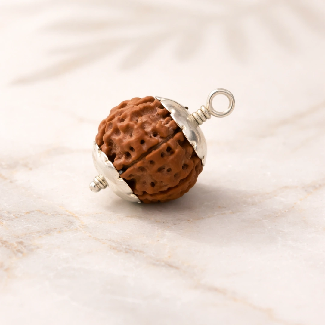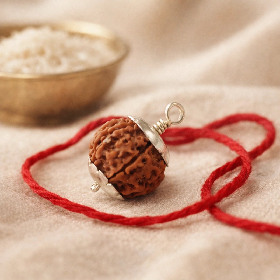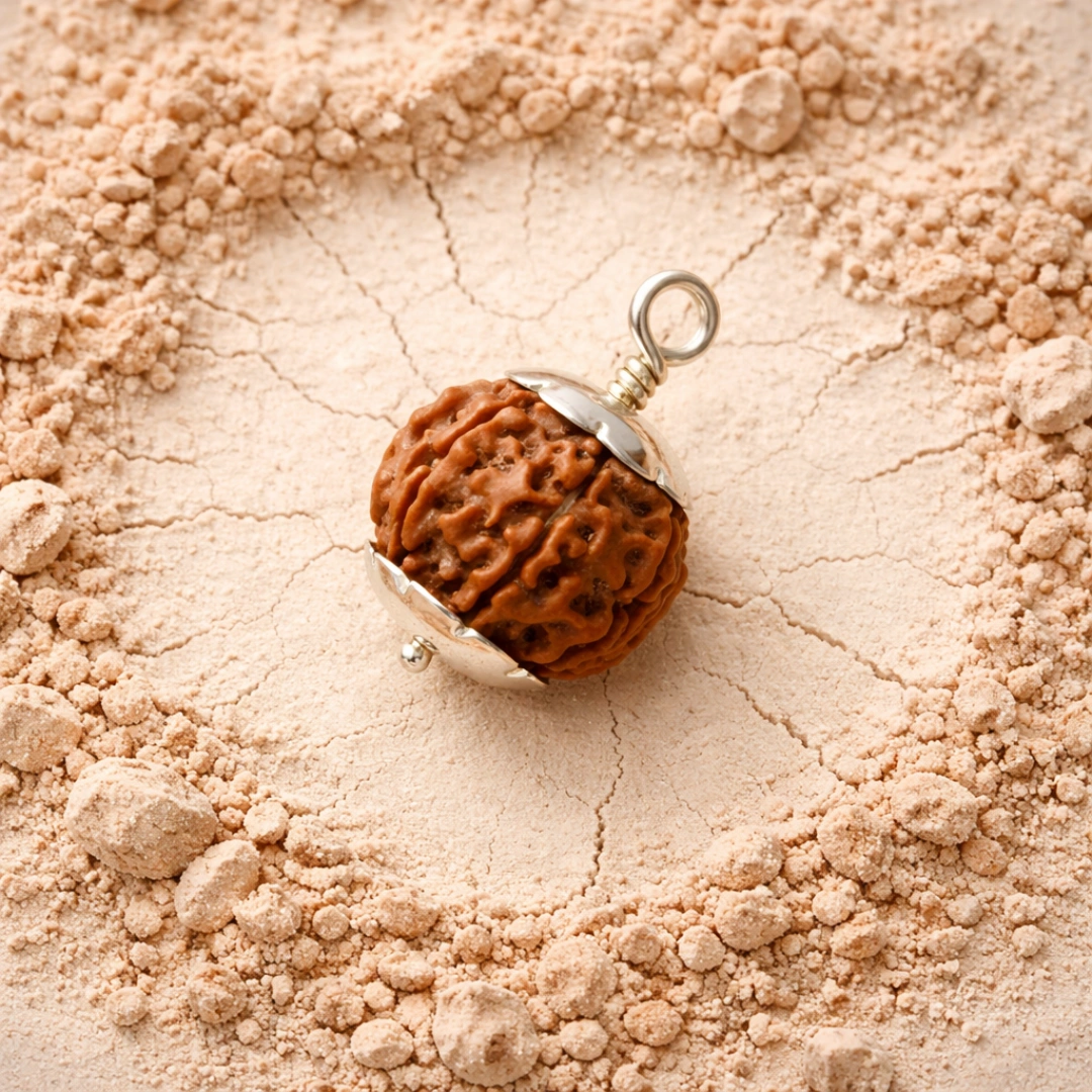 This is why premium rudraksha traditionally comes in silver settings — not gold, not copper. Silver is the specific metal that complements the 7 Mukhi's energy most effectively.