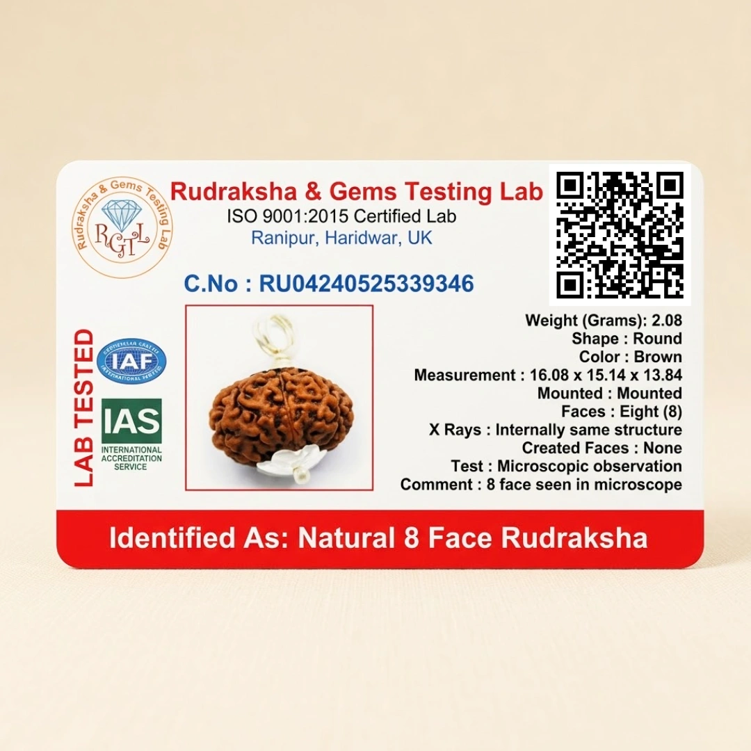 Nepal's high-altitude Himalayan forests produce rudraksha with greater natural density than lower-altitude origins. Every 8 Mukhi here is individually inspected, all eight faces verified, and govt lab certified — not batch tested. The certificate confirms Nepal origin, not Indonesia.