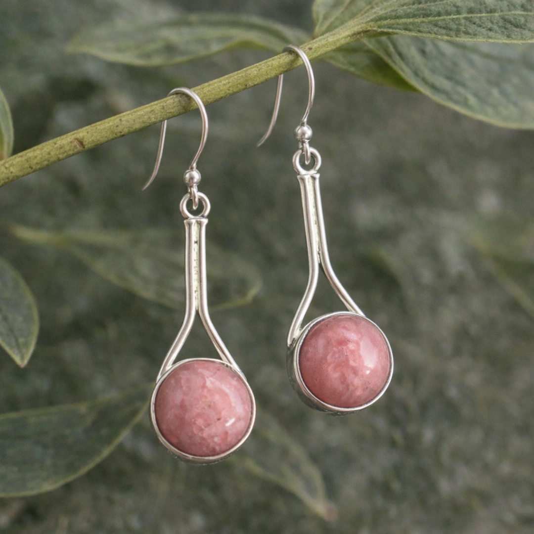 The design is minimalist — a slim silver stem, a round rhodochrosite cabochon, nothing unnecessary. But the stone is rhodochrosite — naturally banded, warm pink, a color that does not fade into the background the way most pink stones do. The result is an earring that goes with everything but is never invisible.