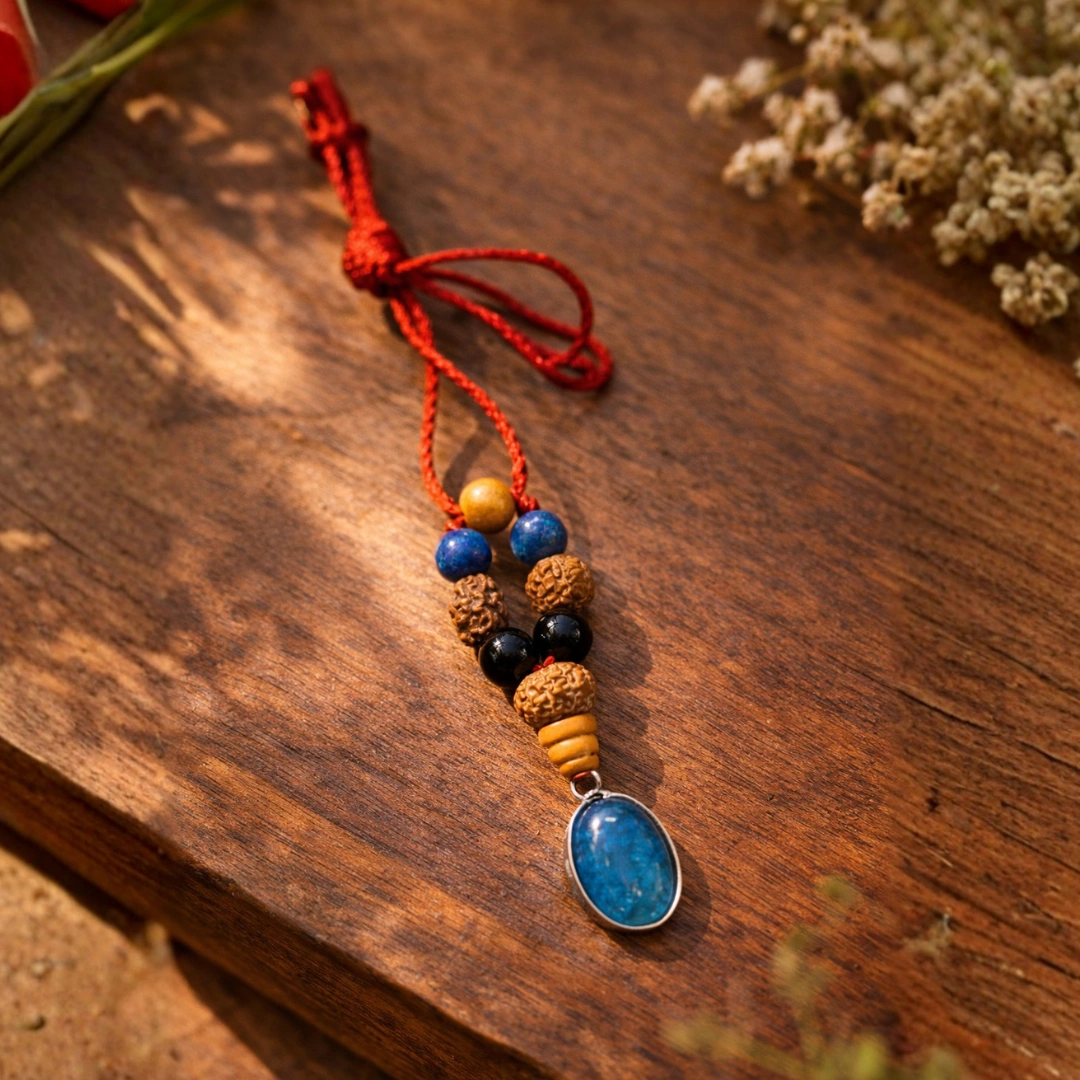 Turquoise activates the authentic truth-speaking voice and ancient protection. Lapis Lazuli adds the deep wisdom and rebel's authority. Black Amethyst quiets the overthinking mind and protects the visionary's energy field. And 3+7+10 Mukhi Rudraksha — Agni, Mahalakshmi, Vishnu — delivers karmic clearing, Saturn's direct abundance blessing, and complete nine-planet protection.