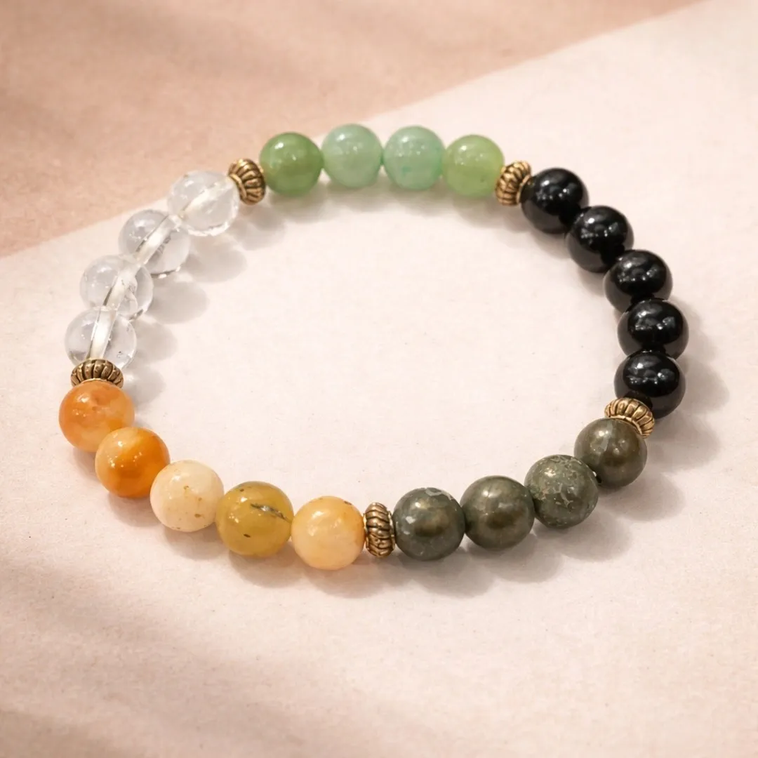 "Pyrite paisa attract karta hai. Green Aventurine luck laata hai. Yellow Aventurine creative soch deta hai. Clear Quartz sab ki energy double karta hai. Hakik protect karta hai. Aur yeh paanch milke teri kalaai pe ek money magnet system banate hain. Rs 599 me. Seedhi baat."