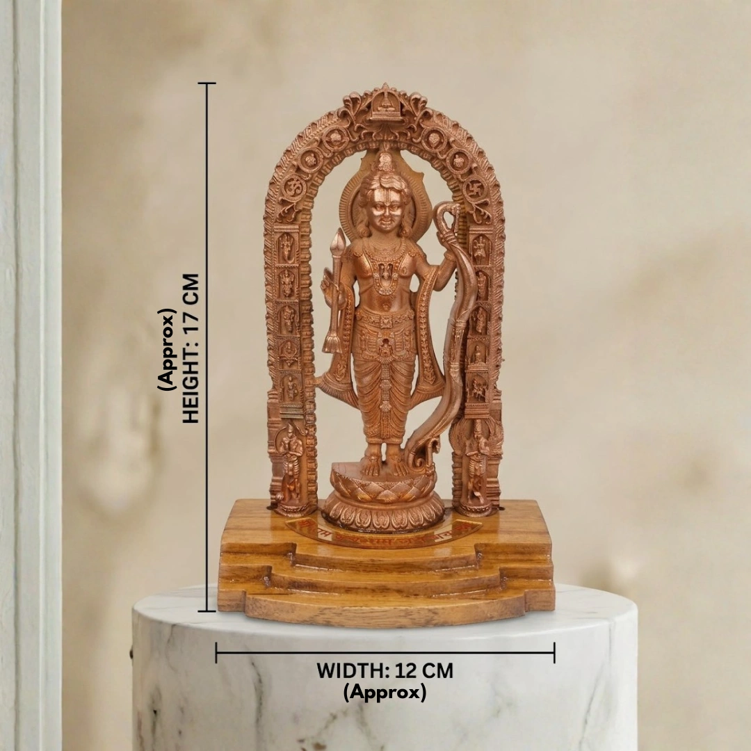 This murti carries that energy. The standing Ram Lalla form — the same form that moved the nation in January 2024 — handcrafted in pure copper, framed by a temple arch that places him exactly where he belongs: at the center, within the divine threshold, completely present.